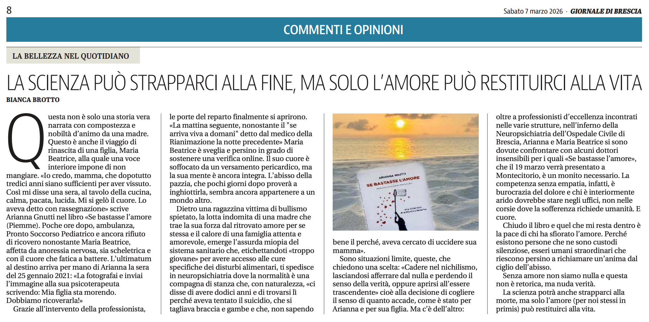 «Io credo, mamma, che dopotutto tredici anni siano sufficienti per aver vissuto. Così mi disse una sera, al tavolo della cucina, calma, pacata, lucida. Mi si gelò il cuore. Lo aveva detto con rassegnazione» scrive Arianna Gnutti nel libro «Se bastasse l’amore (Piemme).