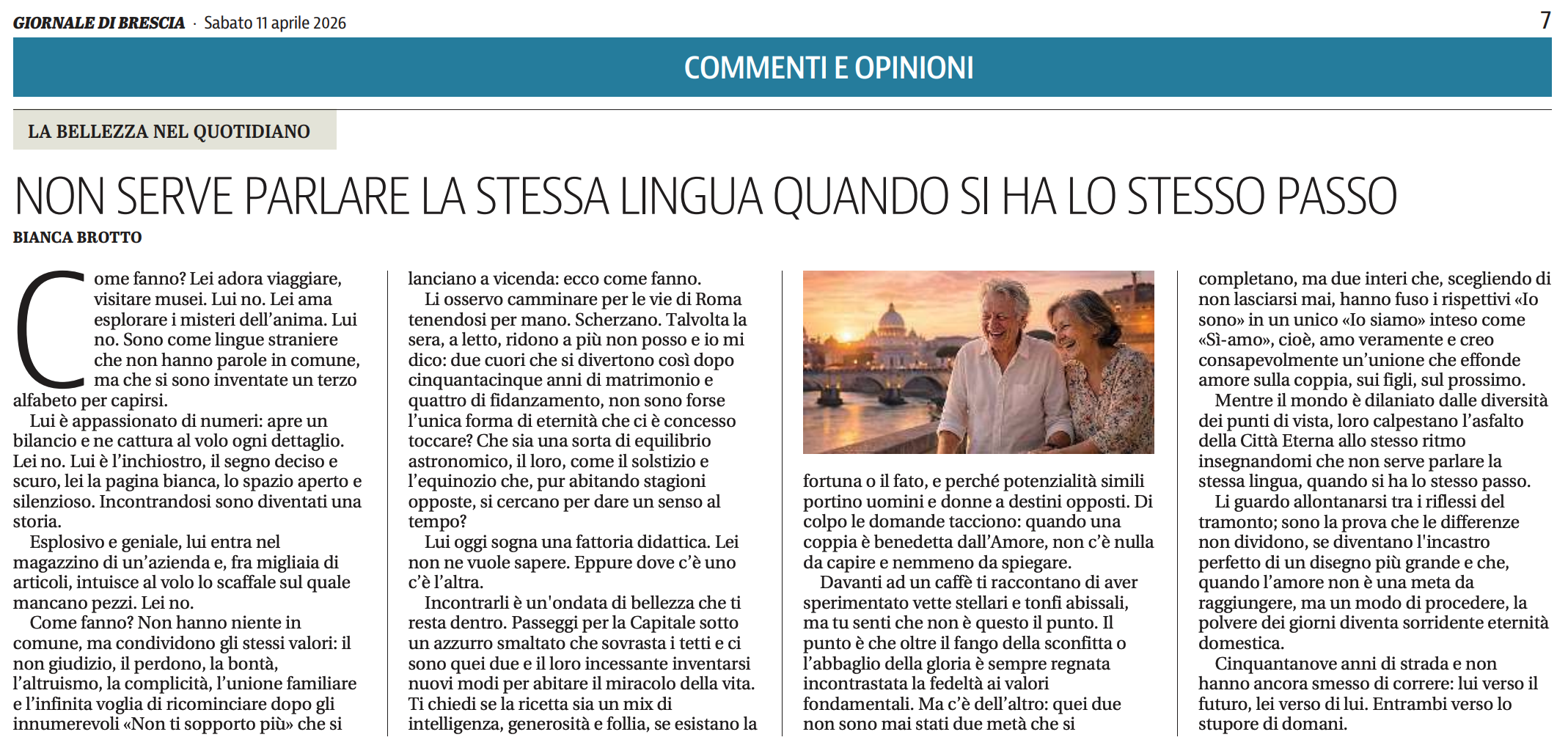Li guardo allontanarsi tra i riflessi del tramonto; sono la prova che le differenze non dividono, se diventano l'incastro perfetto di un disegno più grande e che, quando l’amore non è una meta da raggiungere, ma un modo di procedere, la polvere dei giorni diventa sorridente eternità domestica.
